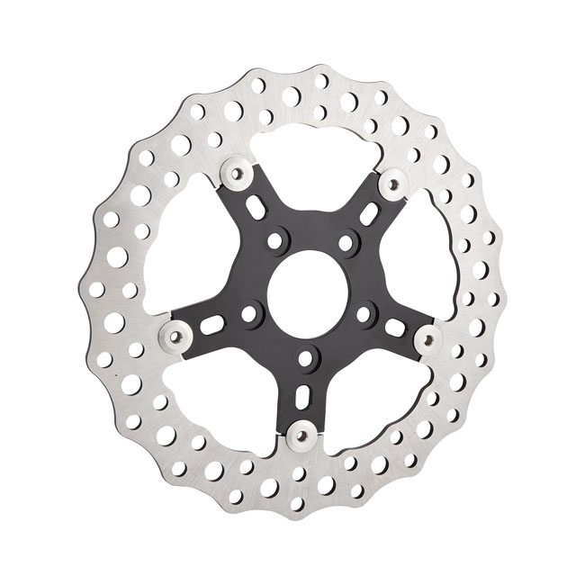 Rotore del freno flottante universale in ‘tipo di montaggio A’, con fori di montaggio annoiati da 3/8″ con un BCD (diametro del cerchio del bullone) da 3,25″ e attacco per mozzo ID da 56,3 mm. Installazione imbullonata per molte applicazioni di serie o personalizzate anteriori e posteriori. Può essere utilizzato universalmente sui modelli con schema di montaggio H-D a 5 bulloni di serie con un diametro interno del mozzo di 56,3 mm. – Rotori freno flottanti ad alte prestazioni progettati per migliorare le prestazioni di frenata e lo stile delle ruote di fabbrica o aftermarket – Costruzione in acciaio inossidabile 420, tagliato e forato al laser per prestazioni ottimali – Design in acciaio inossidabile per carichi pesanti realizzato per il peso dei Touring pesanti – Montaggio universale – Può essere installato sulla parte anteriore o posteriore della maggior parte dei modelli H-D con rotori di fabbrica montati sul mozzo a 5 bulloni – Fori di montaggio svasati da 3/8″ (9,5 mm) – Diametro interno 56,3 mm
